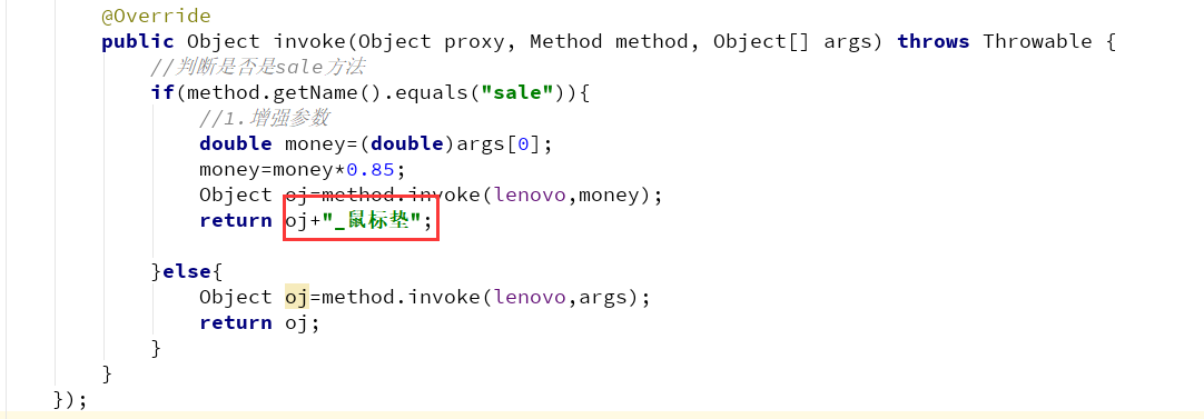 @Override public Object invoke(Object proxy, Method method, Object[] args) throws Throwable { if(method.getName().equals("sale")){ double money=(double)args[0]; money=money*0.85; System.out.println("专车接你。。。"); Object oj=method.invoke(lenovo,money); System.out.println("免费送货。。。"); return oj+"_鼠标垫";