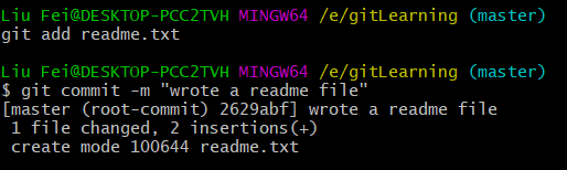 1 file changed:1个文件被改动(我们新添加的readme.txt文件);2 insertions:插入了两行内容(readme.txt有两行内容)。