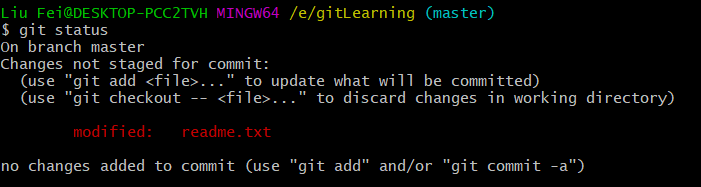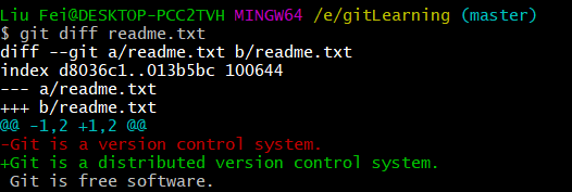 git status命令可以让我们时刻掌握仓库当前的状态,上面的命令输出告诉我们,readme.txt被修改过了,但还没有准备提交的修改。