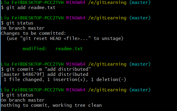 知道了对readme.txt作了什么修改后,再把它提交到仓库就放心多了,提交修改和提交新文件是一样的两步: