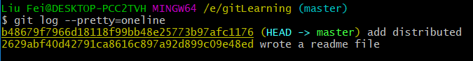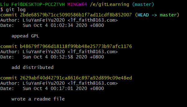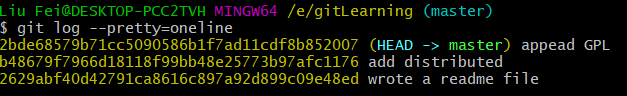 git log命令显示从最近到最远的提交日志,我们可以看到3次提交,最近的一次是append GPL,上一次是add distributed,最早的一次是wrote a readme file。
