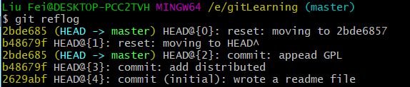 Git提供了一个命令git reflog用来记录你的每一次命令: