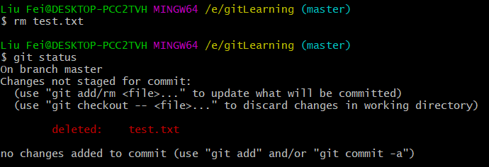 这个时候,Git知道你删除了文件,因此,工作区和版本库就不一致了,git status命令会立刻告诉你哪些文件被删除了: