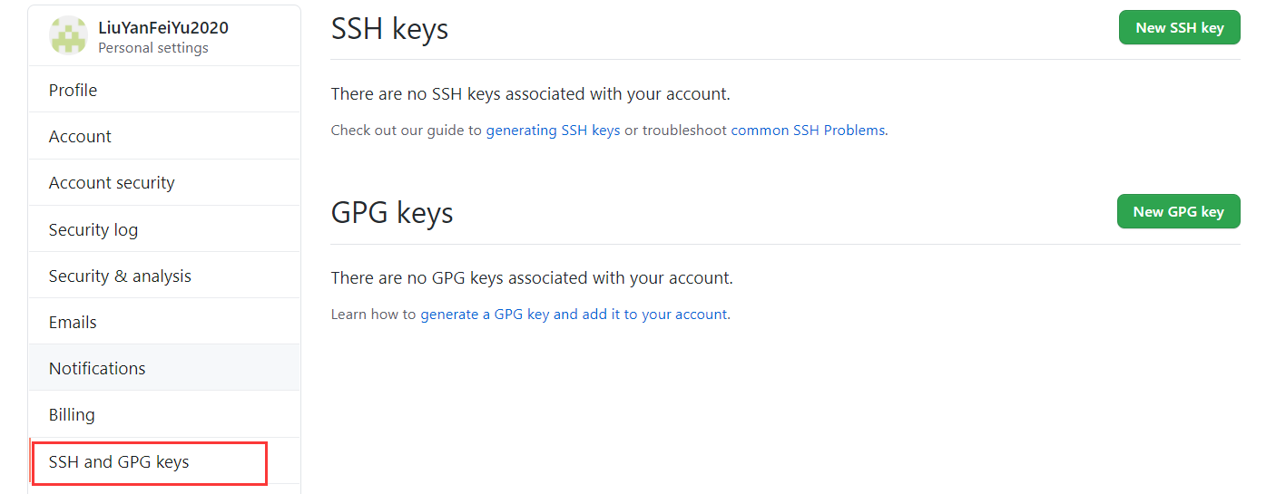 第二步:SSH密钥设置,登陆GitHub,打开settings-> SSH and GPG keys页面: