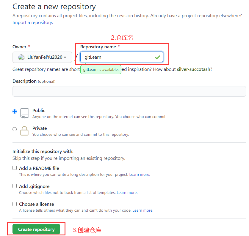 gitLearn,其他保持默认设置,点击Create repository按钮,就成功地创建了一个新的Git仓库: