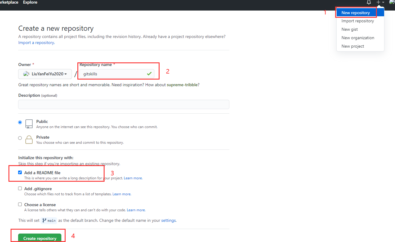 - 首先,登陆GitHub,然后,在右上角找到“Create a new repo”按钮,创建一个新的仓库: