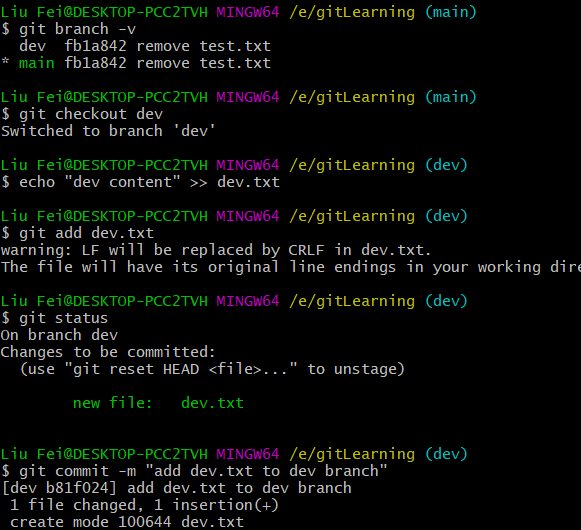 示例:切换到dev分支,然后添加dev.txt文件并进行提交