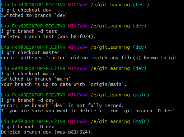 示例:在dev分支上删除test分支,test分支相对于dev来说是干净的分支,所以可以直接删除,然后切换到master分支,删除dev分支,此时需要进行强制删除。