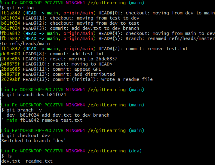 思路:对于已经有提交记录的分支删除后,实际上只是删除指针,commit记录还保留,如果想恢复,需要使用git reflog查找该分支指向的commitId,然后根据commitId创建新的分支