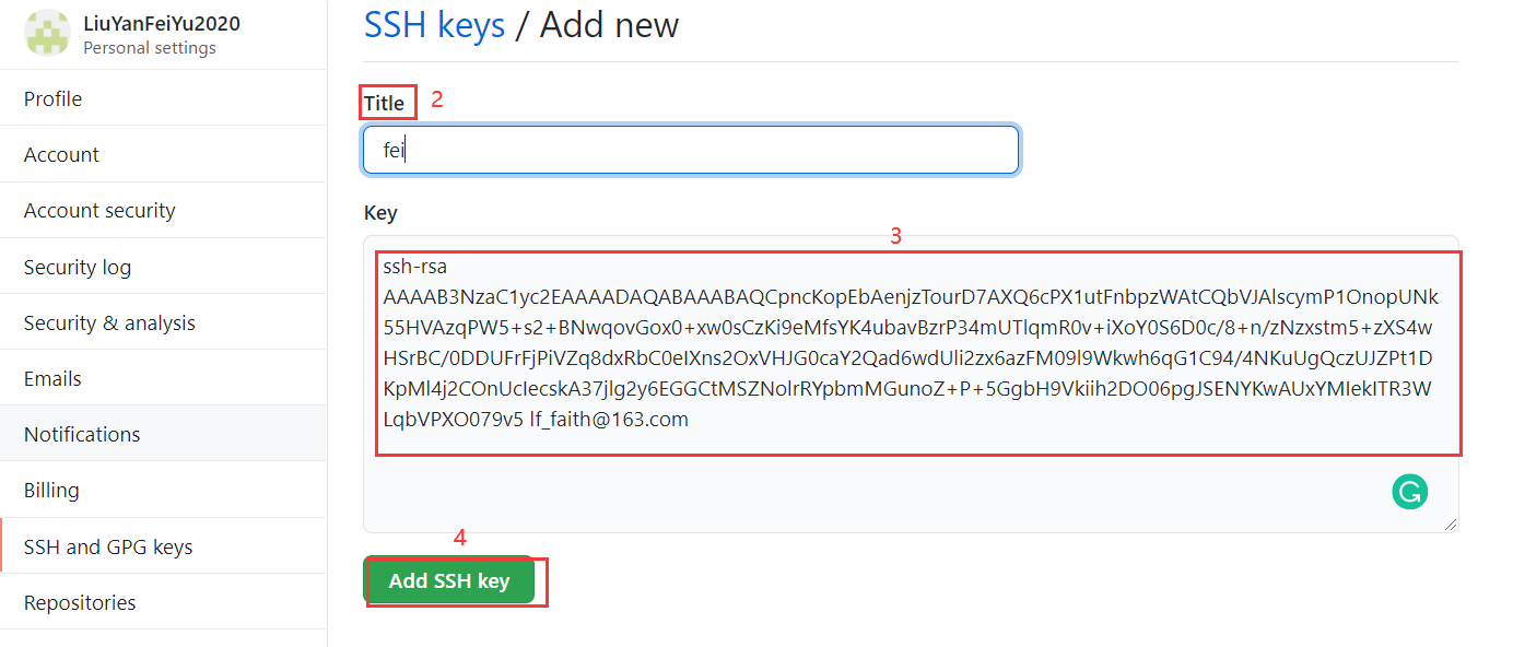 然后,点New SSH Key,填上任意Title,在Key文本框里粘贴