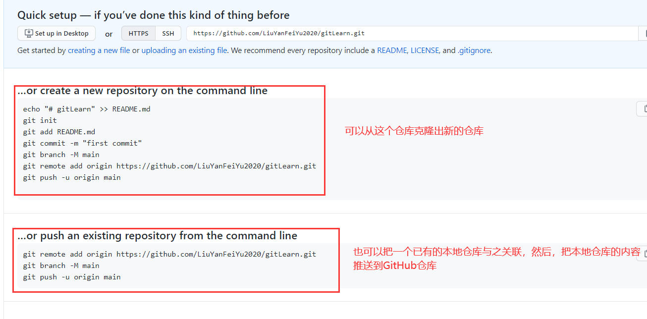 gitLearn仓库还是空的,GitHub告诉我们,可以从这个仓库克隆出新的仓库,也可以把一个已有的本地仓库与之关联,然后,把本地仓库的内容推送到GitHub仓库。