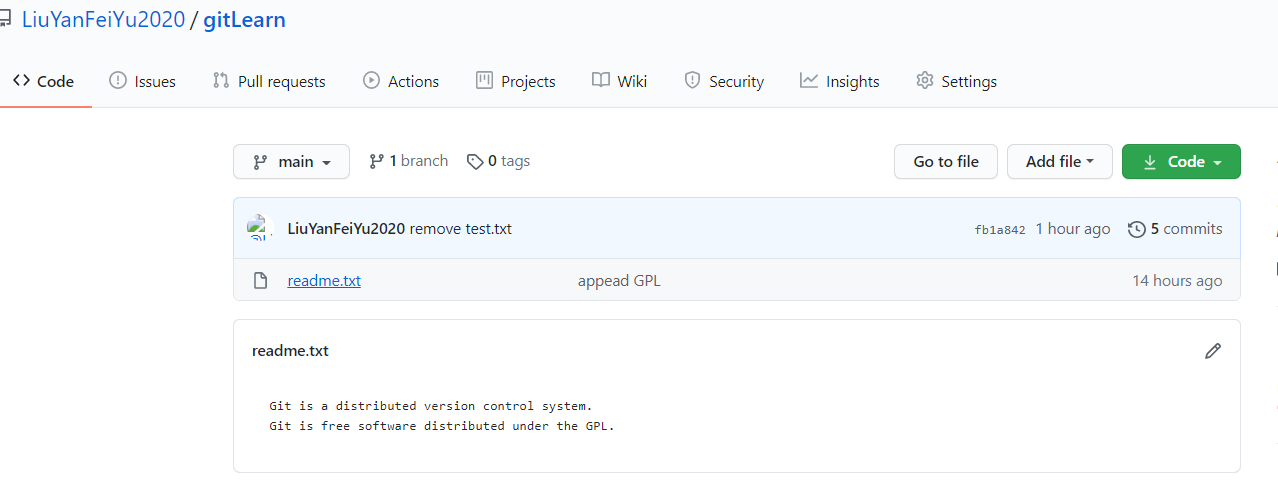 1 file changed:1个文件被改动(我们新添加的readme.txt文件);2 insertions:插入了两行内容(readme.txt有两行内容)。